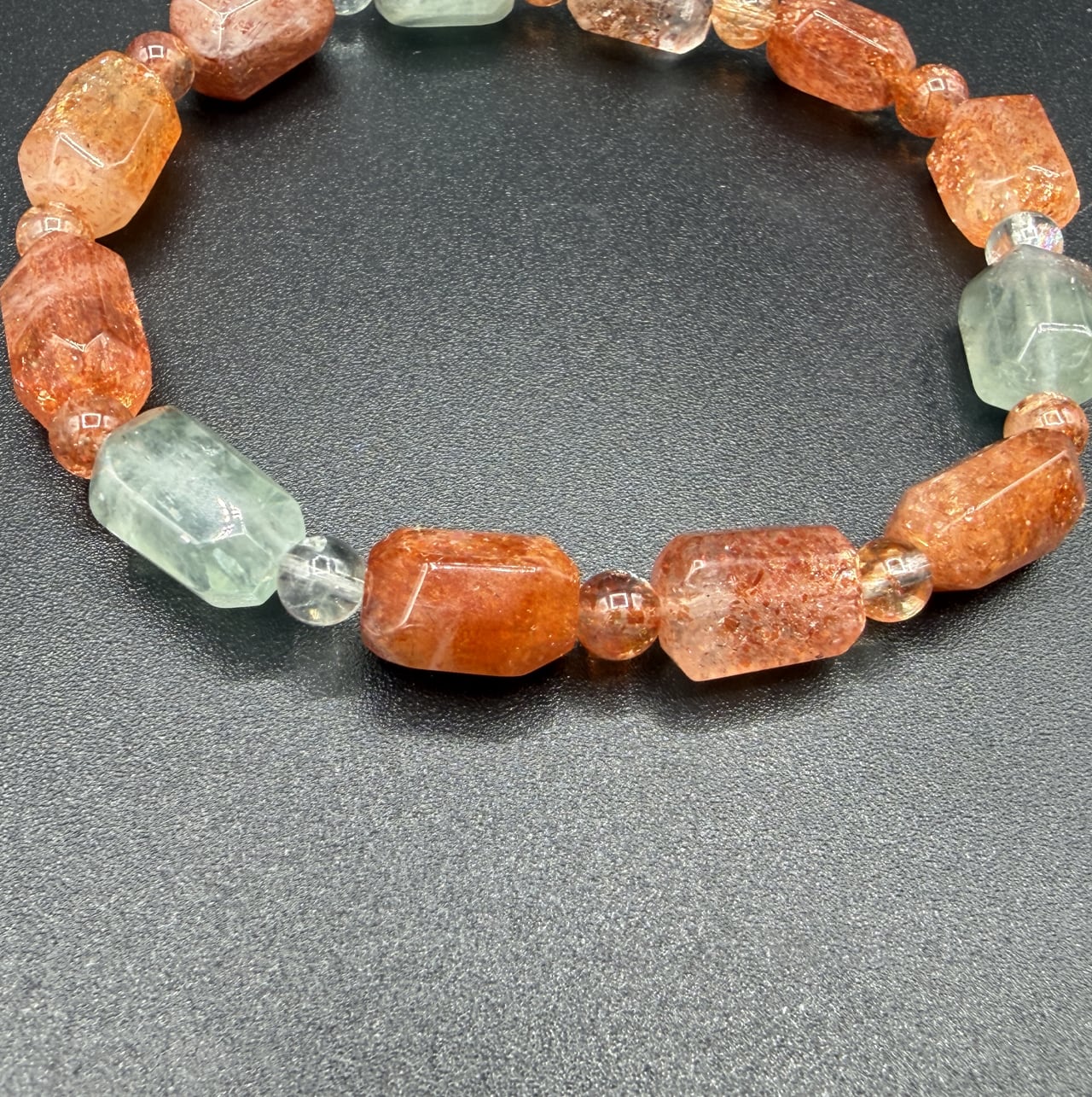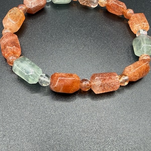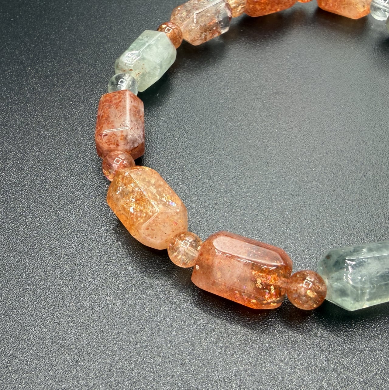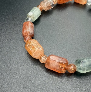 本品は、オレンジ〜レッドのサンストーンに加え、ミントグリーンのフェルスパー(長石)を組み合わせています。